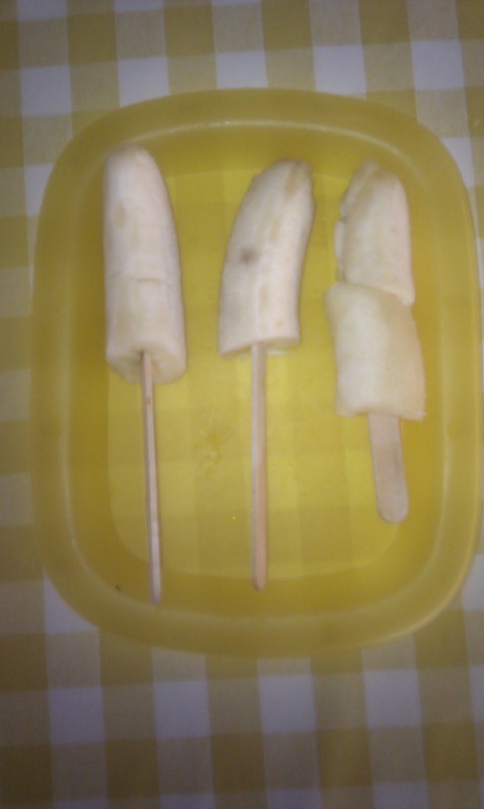 These are great. I loved them so much when I was a kid and they are perfect for over ripe bananas. Basically what you do is insert a lollipop stick into a banana (I like to cut the bananas in half). Place them on a tray in the freezer i.e. open freeze them, then once they are frozen you can put them in a container (this way they won’t stick together).