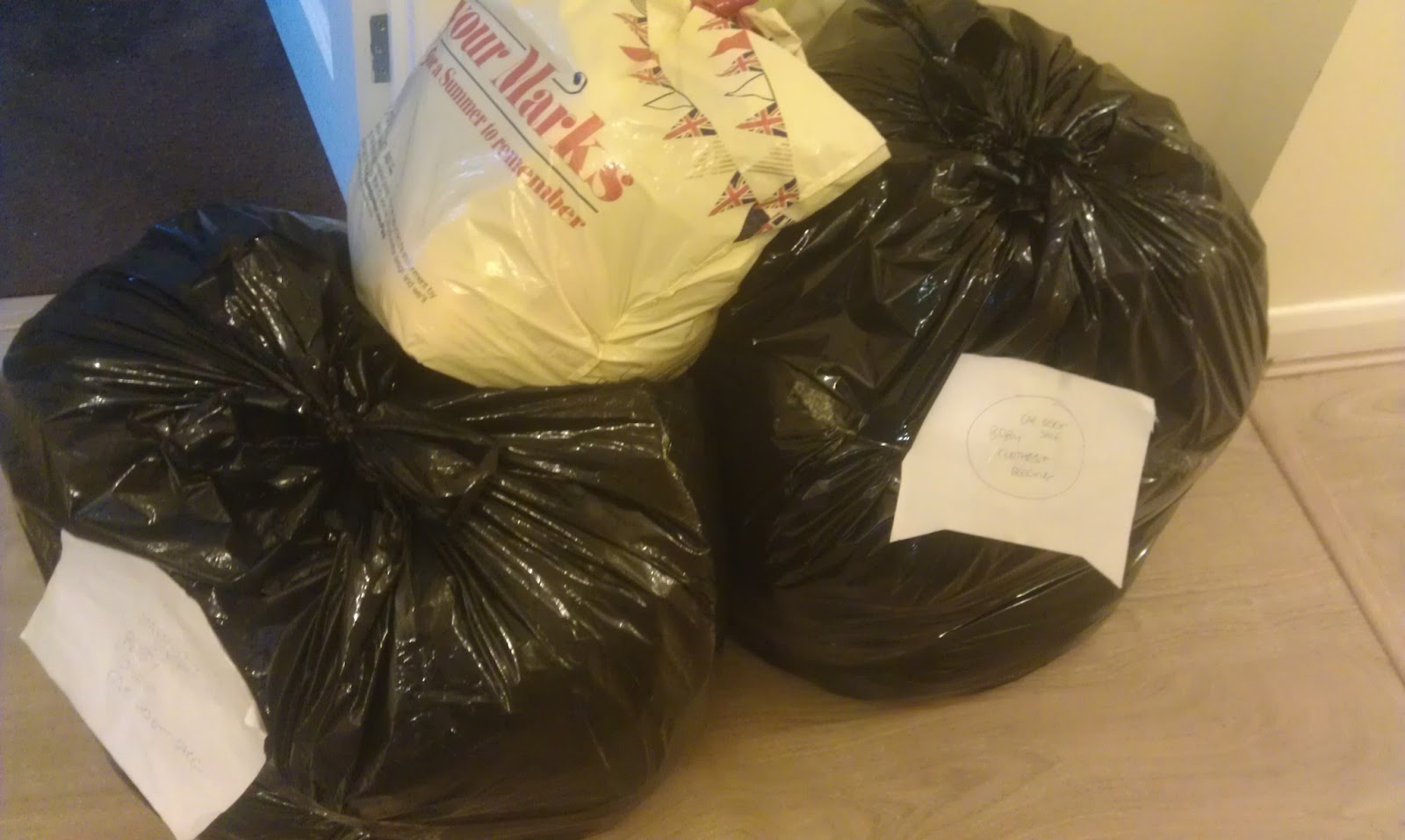 I bagged up all the clothes (as pictured at the top) and put labels on them. I took a leaf out of A Thrifty Mrs‘ book and wrote the labels on the backs of some envelopes. Then I stuck them on with sticky tape.