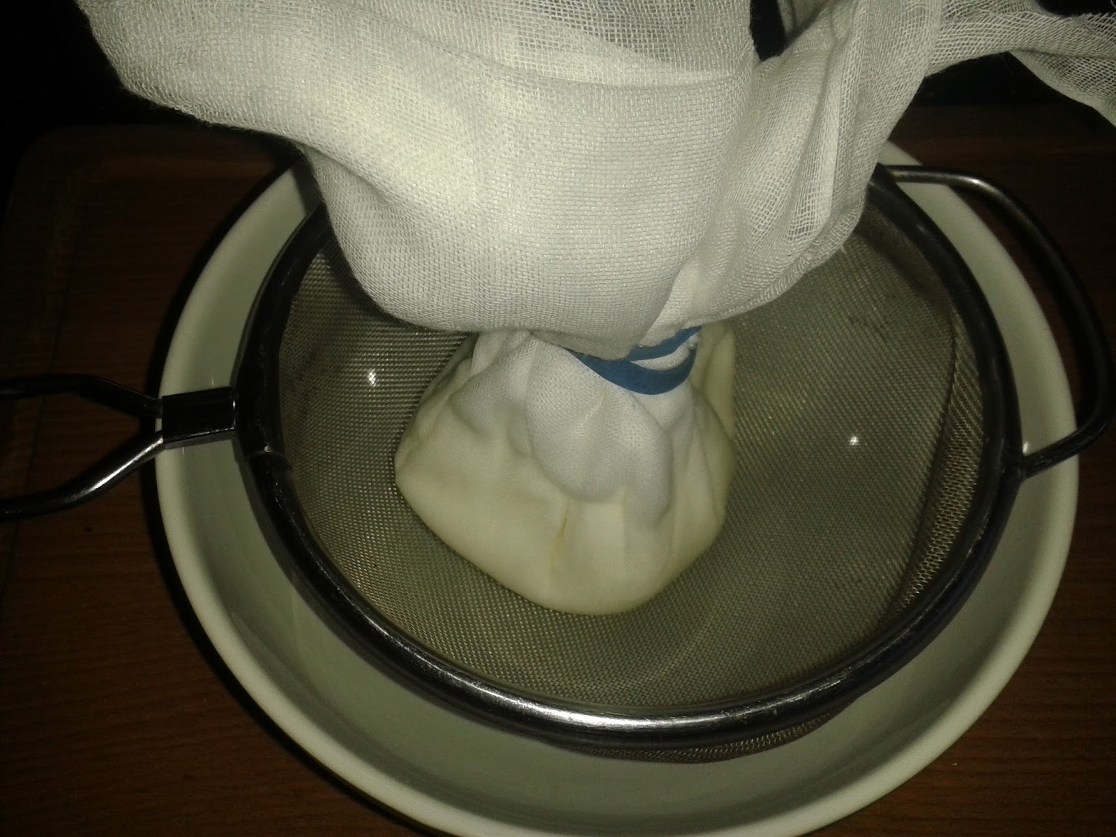 I used a sheet of cheese cloth, folded it over several times, poured a small jar of yoghurt into it, then tied it up with an elastic band.  The idea that you are supposed to suspend it over a pot for several hours (some sites say for up to 3 days!) to catch the drips in cool conditions.  You can put it in the fridge, but that is meant to reduce the flavour.