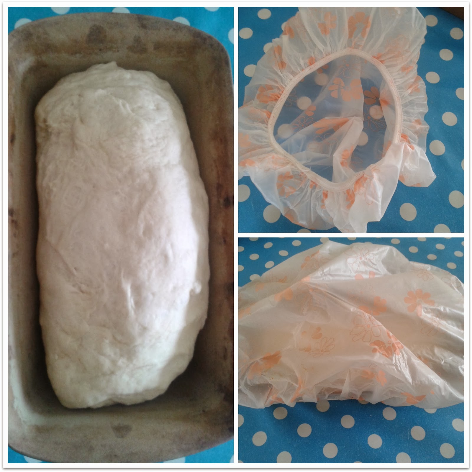 Westywrites is also starting to prepare now for Plastic Free July and the other day fell out of love with clingfilm, which reminded me that for ages now I have been meaning to buy a shower cap.  Not for my hair – as an alternative to clingfilm.  So today while doing my ‘local shopping’ I bought one. When I got home I made some bread dough in my bread maker, then put it in a loaf tin to rise covered with the shower cap!