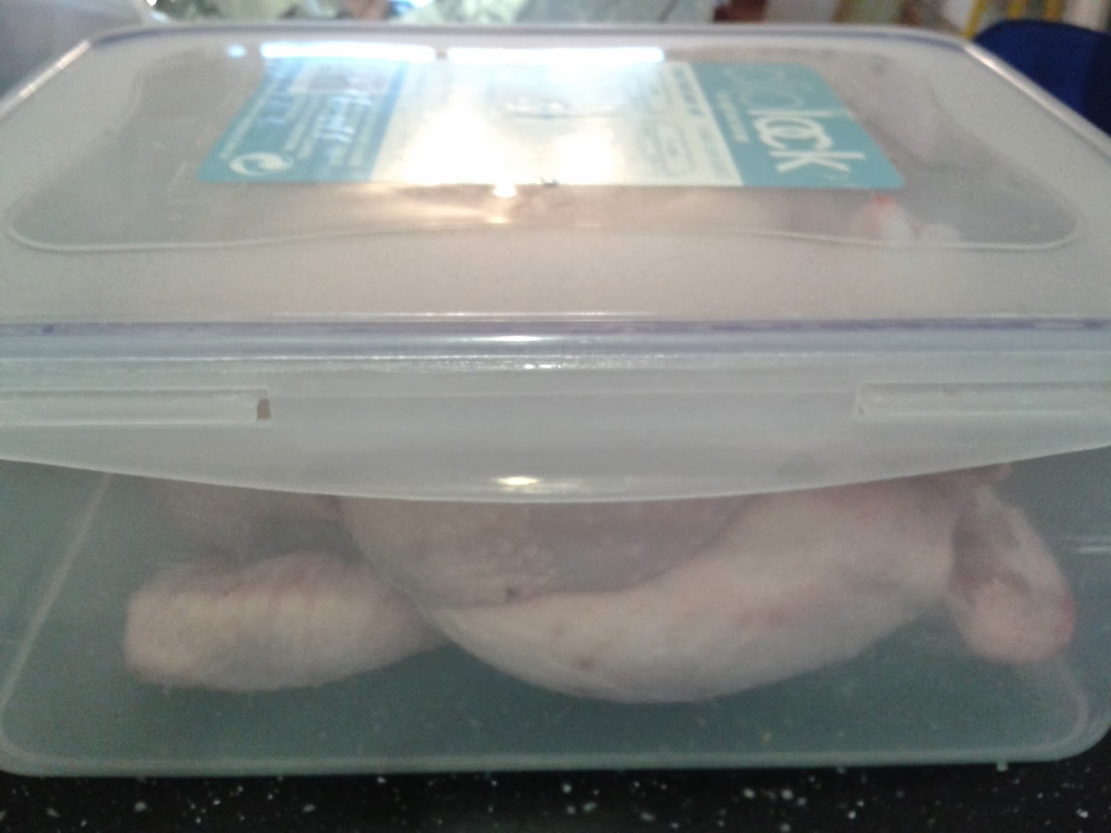 The tub has a lid to it, but as you can see the chicken was a bit too big for it. When I got home I realised that actually I did need a tub with a lid as I wanted to store it in the fridge for a bit. I dug around in the cupboards and remembered that I had a large container with a lid. It was being used to store flour, but it didn’t need to be, so I re-homed the flour and put the chicken in it.