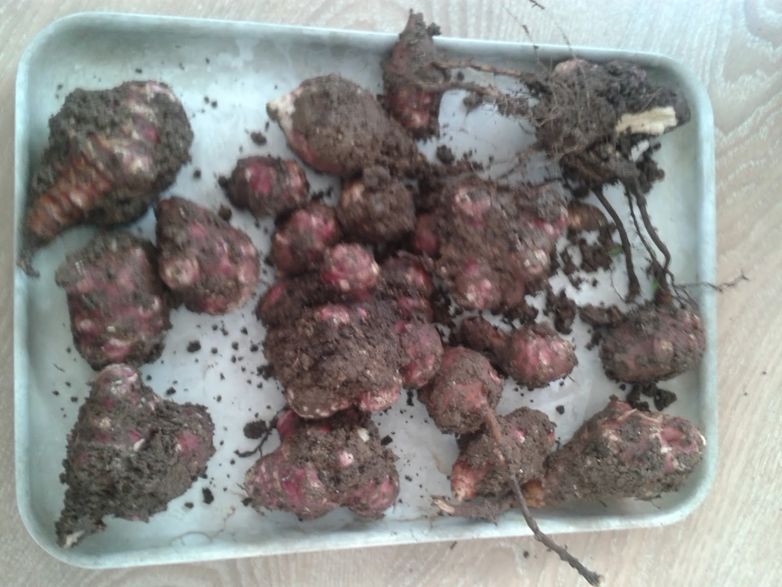 My husband planted them in the garden and two of them grew and grew and grew! They got really tall – around 6ft high. Eventually though they wilted and died and today was the day that my husband decided to dig them up. From our original 3 tubers (one of which died soon after we got it), we got around 20 tubers, plus a couple that have been left in the ground as well. The hope is they will grow again next year…