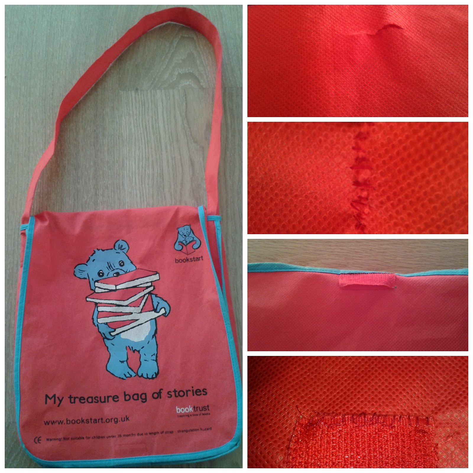 Earlier today, the velcro bit on one of the kids bags (one of those free ones that you get from those lovely library bookstart packs) got caught on a rug and I tugged it a bit too hard and the velcro came away from the bag a bit.