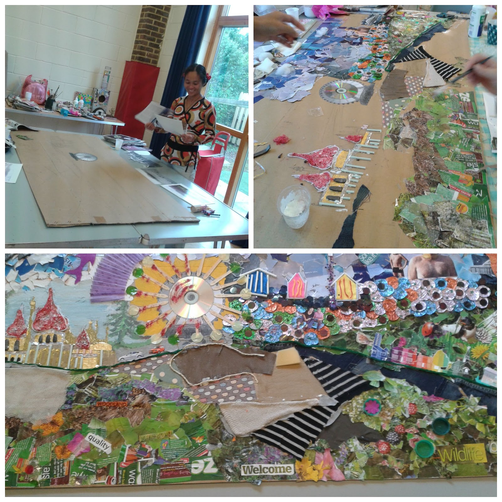 Hong Dam (@HongDamArtist on Twitter) a local artist came along and did a junk mural workshop. Everyone joined in to make a picture of Brighton with the Pavilion, the wheel, the South Downs, the sea and the community centre in it out of scrap from magazines and other scrap materials. I am not an artist but had a go – I did a little bit of the sky and added some red mesh to the Brighton Pavilion (my artistic interpretation of it 🙂 ). We were all pretty pleased with the result, which I think is now hanging in the community centre.