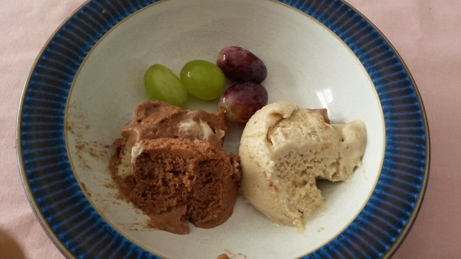 There were only two ingredients in this delicious icecream – bananas and cocoa powder. She chopped up some very ripe bananas, froze them, then blended them until they became white and creamy. Then into half the mixture she added some cocoa powder. She filled an empty icecream tub so it was half filled with the chocolatey banana mixture and half filled with the plain one and refroze it.