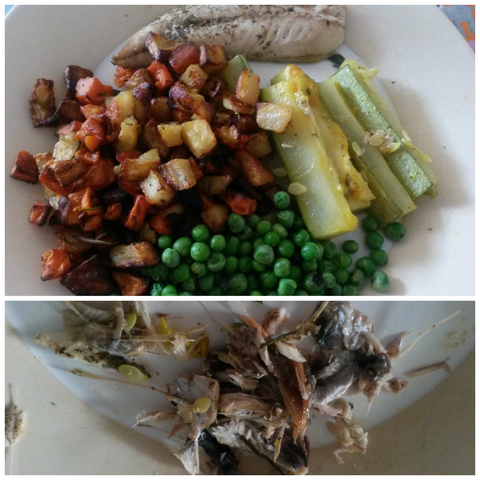 For dinner we had some mackeral which had been in the freezer for a while and I had forgotten about, some chopped up potatoes and sweet potatoes and some peas. I also had some more of the massive courgette, which tasted absolutely amazing steamed with the fish! As I said before I did put the potato peel and fish bones and bits the kids didn’t like in the compost at the end of the meal.