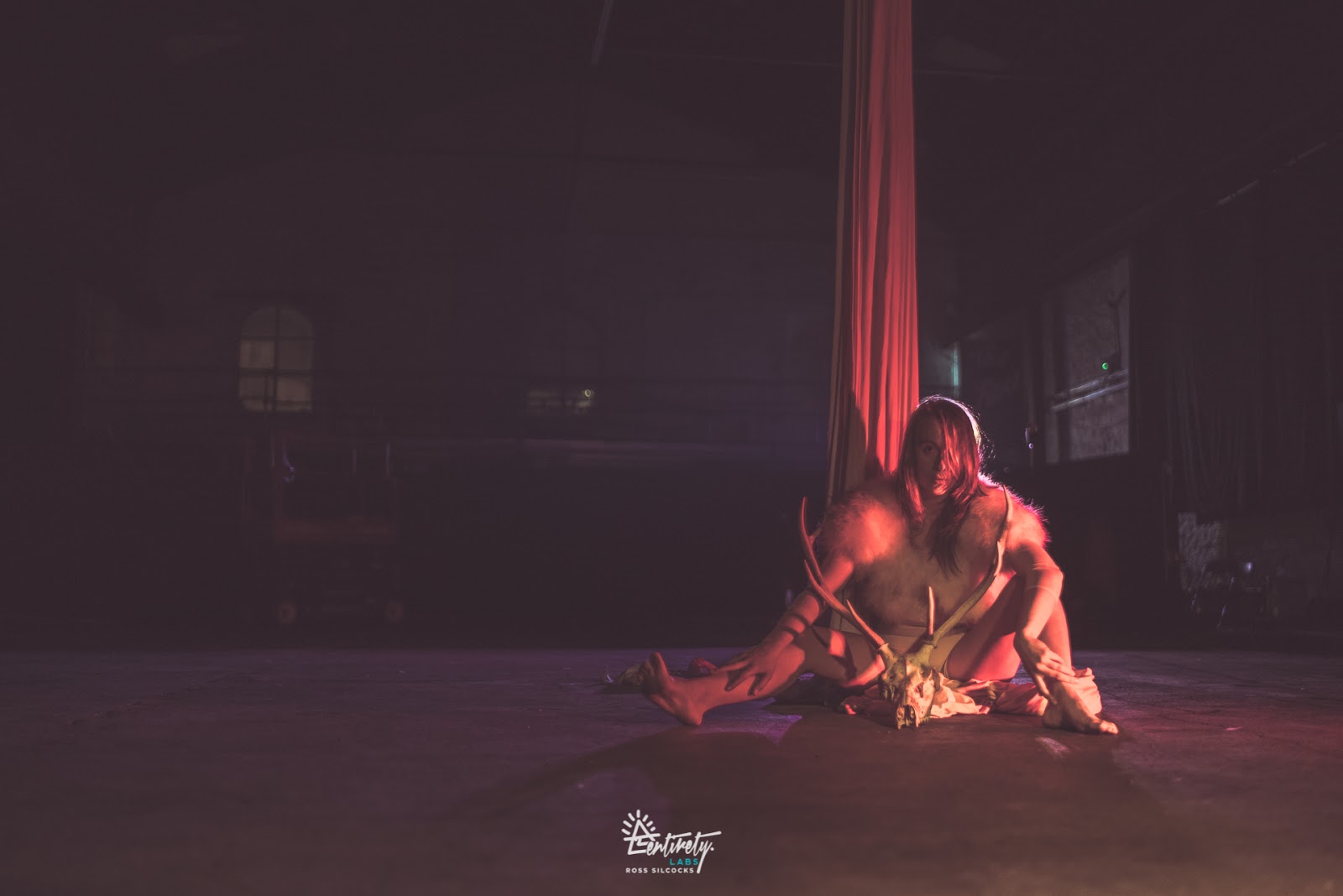 The show incorporates various performance skills from aerial circus to physical theatre to butoh, as a cross form collaboration that explores mythology, ritual and the environment. It’s set against a massive industrial warehouse which serves as the perfect modern space to explore in, not only this but the space is part of Bristol’s biggest nightclub venue, a purposeful contrast to the thematic content that speaks to us about nature.